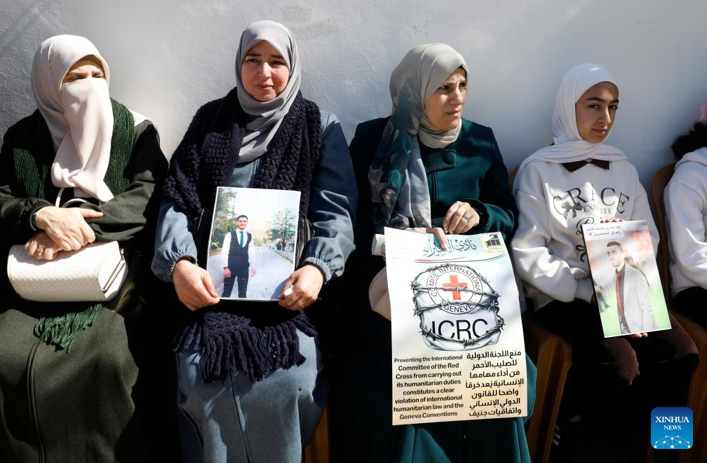 Palestinians and activists take part in a protest in front of the International Committee of the Red Cross (ICRC) office in Hebron City in the West Bank, on Feb. 10, 2026. Protesters condemned Israel for blocking the Red Cross's humanitarian work and called on the international community to uphold international law and ensure the ICRC's free operation. (Photo by Mamoun Wazwaz/Xinhua)