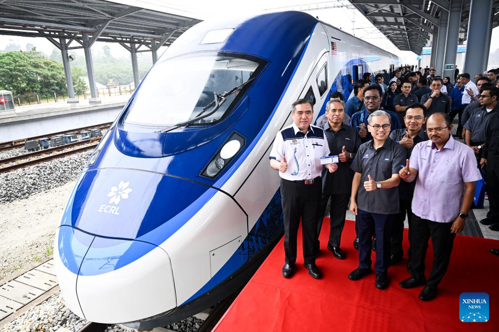 As the East Coast Rail Link (ECRL), a mega rail project in Malaysia being built by the China Communications Construction Company (CCCC), moves rapidly towards completion, its first train sets for freight cargo and passengers were unveiled in Pahang state on Wednesday. (Xinhua/Cheng Yiheng)