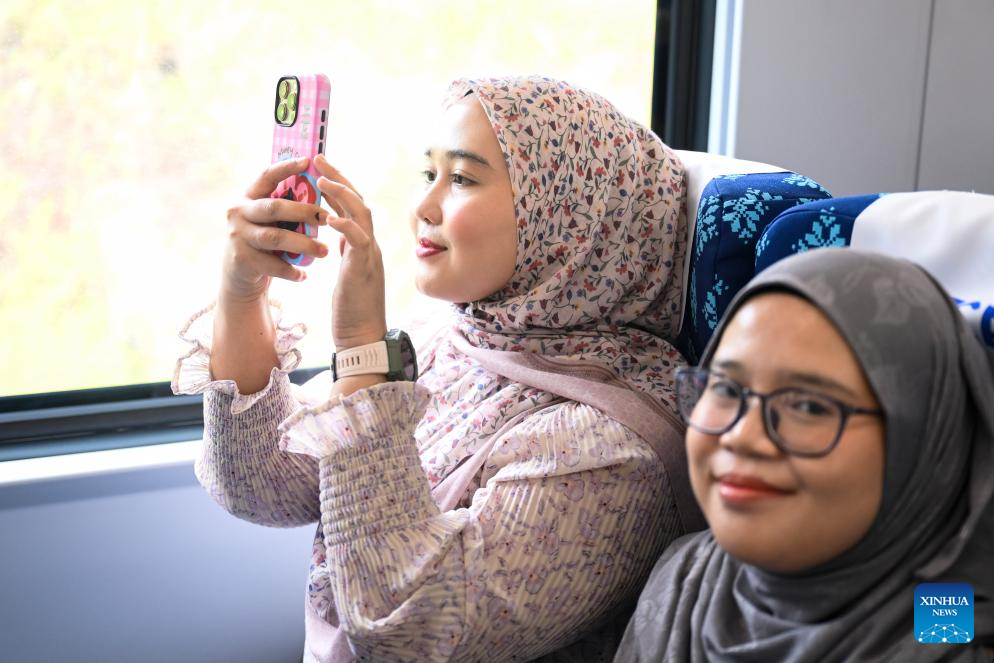 Guests pose for photos with an electric multiple unit (EMU) passenger train in Pahang state, Malaysia, Feb. 11, 2026. As the East Coast Rail Link (ECRL), a mega rail project in Malaysia being built by the China Communications Construction Company (CCCC), moves rapidly towards completion, its first train sets for freight cargo and passengers were unveiled in Pahang state on Wednesday. (Xinhua/Cheng Yiheng)