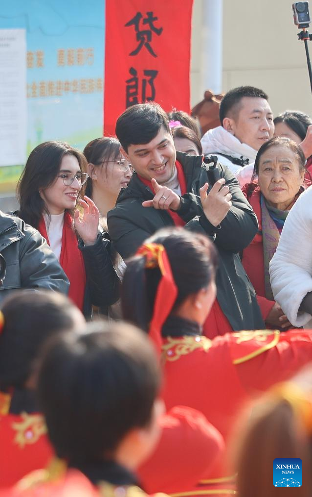 Suleimanov Umar (C front) and his friends visit Yinggezhai Village in Chuanfangyu Town of Jizhou District, north China's Tianjin, Feb. 10, 2026. On the occasion of traditional Chinese Xiaonian Festival in northern China, which fell on Tuesday this year, Suleimanov Umar, a 26-year-old Tajikistan student in Nankai University of Tianjin, and other international students visited a local festive fair in Chuanfangyu Town to experience the vibrant traditions of Chinese New Year. Celebrated on the 23rd day of the last month of the Chinese lunar calendar, Xiaonian is a festival marking the start of the countdown to the Chinese New Year.