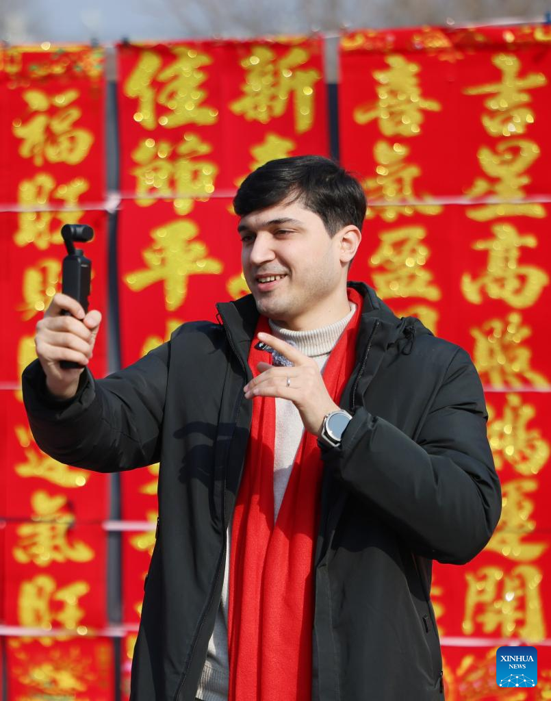 Suleimanov Umar films a video at a festive fair in Chuanfangyu Town of Jizhou District, north China's Tianjin, Feb. 10, 2026. On the occasion of traditional Chinese Xiaonian Festival in northern China, which fell on Tuesday this year, Suleimanov Umar, a 26-year-old Tajikistan student in Nankai University of Tianjin, and other international students visited a local festive fair in Chuanfangyu Town to experience the vibrant traditions of Chinese New Year. Celebrated on the 23rd day of the last month of the Chinese lunar calendar, Xiaonian is a festival marking the start of the countdown to the Chinese New Year.