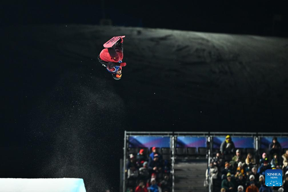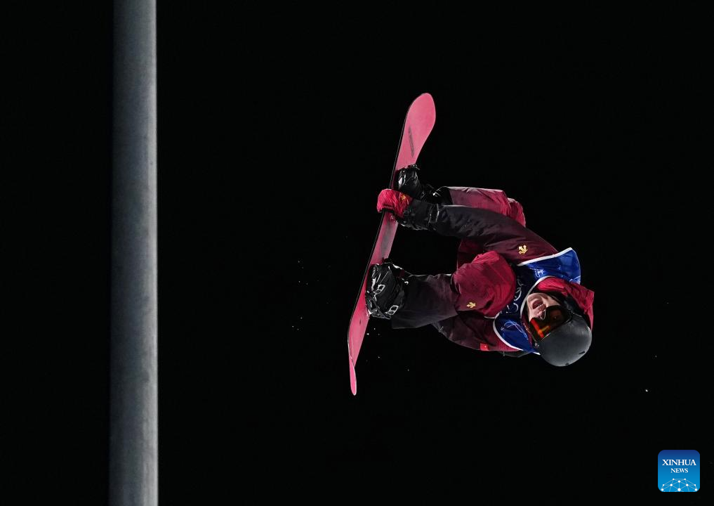 Ren Chongshuo of China competes during the men's snowboard halfpipe qualification at the Milan-Cortina 2026 Olympic Winter Games in Livigno, Italy, Feb. 11, 2026. (Xinhua/Zhang Hongxiang)