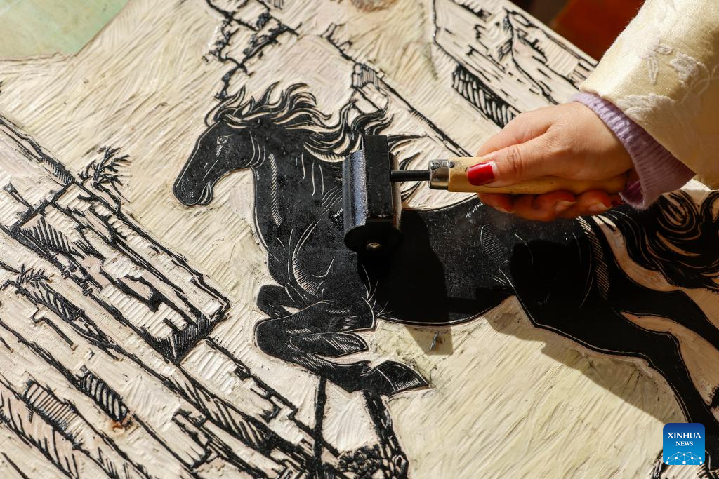 Xue Yin, an inheritor of Huizhou woodblock printing, makes a print themed on the Year of the Horse at a studio in Tunxi District of Huangshan City, east China's Anhui Province, Jan. 6, 2026.(Xinhua/Zhou Mu)