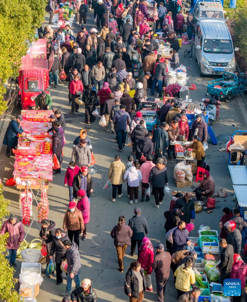 This aerial drone photo shows people purchasing goods needed for the Chinese New Year celebrations at a market in Yinji Township of Huai'an City, east China's Jiangsu Province, Feb. 13, 2026. Markets across the country are bustling nowadays as people flock there to stock up on goods in preparation for the upcoming Spring Festival, or the Chinese New Year. (Photo by Yang Yugang/Xinhua)
