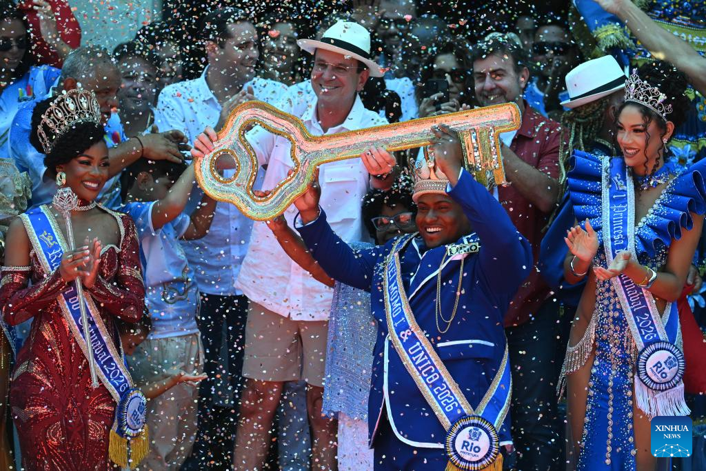 Rio de Janeiro Mayor Eduardo Paes hands over a golden key to the Carnival King at a ceremony that officially kicks off Carnival in Rio de Janeiro, Brazil, on Feb. 13, 2026. Rio de Janeiro Mayor Eduardo Paes on Friday handed over a golden key to the Carnival King, marking the official opening of the Carnival in the city. (Xinhua/Lucio Tavora)