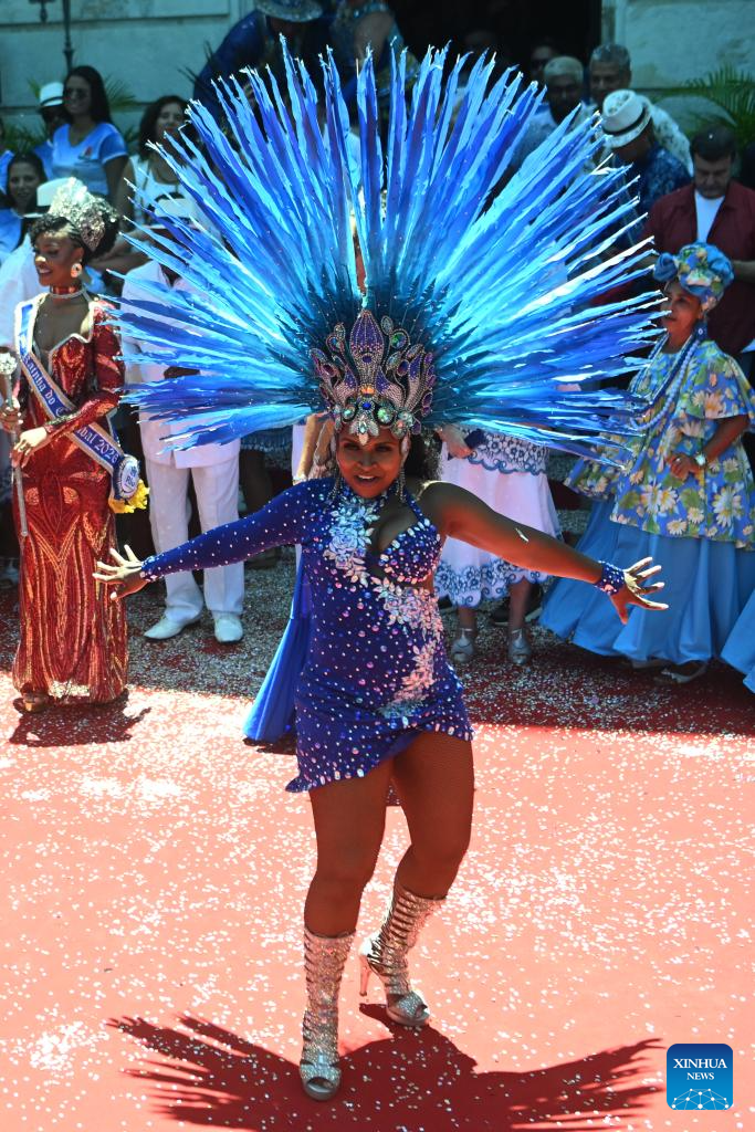 Carnival Queen dances at a ceremony that officially kicks off Carnival in Rio de Janeiro, Brazil, on Feb. 13, 2026. Rio de Janeiro Mayor Eduardo Paes on Friday handed over a golden key to the Carnival King, marking the official opening of the Carnival in the city. (Xinhua/Lucio Tavora)
