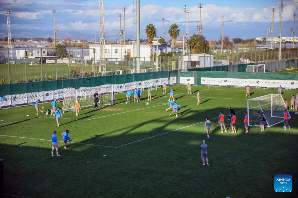 Players from a European football club are seen participating in winter training in Antalya, Türkiye, on Feb. 14, 2026. (Mustafa Kaya/Handout via Xinhua)