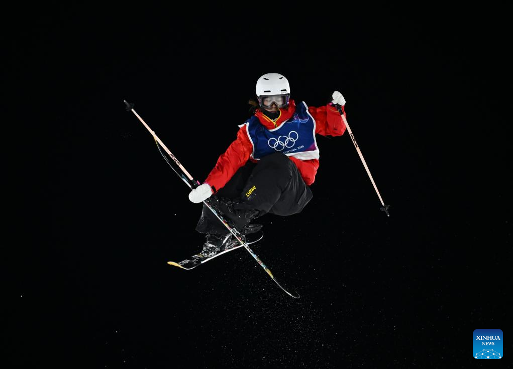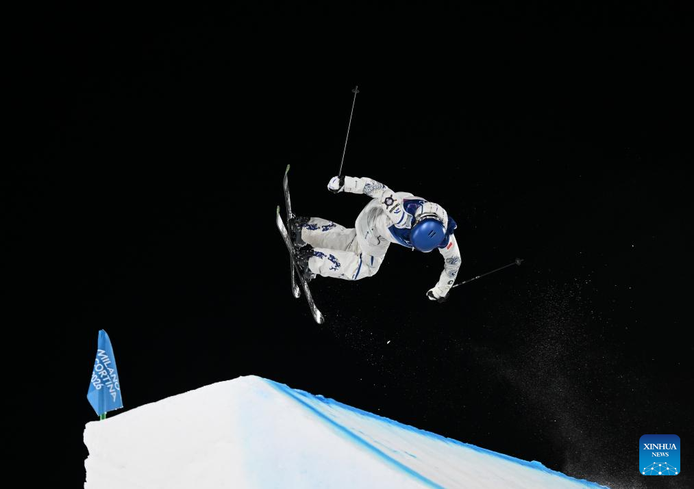 Liu Mengting of China competes during the free skiing women's freeski big air qualification at the Milan-Cortina 2026 Olympic Winter Games in Livigno, Italy, Feb. 14, 2026. (Xinhua/Zhang Hongxiang)