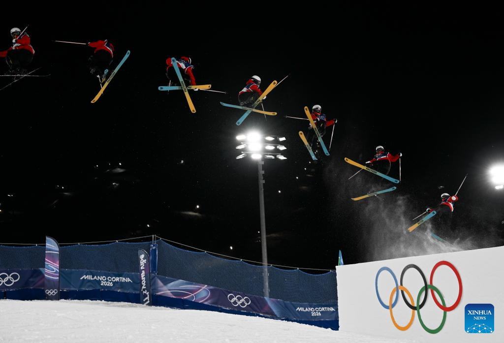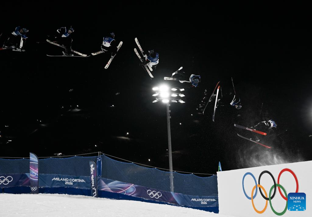 This multi-exposure photo shows Liu Mengting of China competing during the free skiing women's freeski big air qualification at the Milan-Cortina 2026 Olympic Winter Games in Livigno, Italy, Feb. 14, 2026. (Xinhua/Xia Yifang)