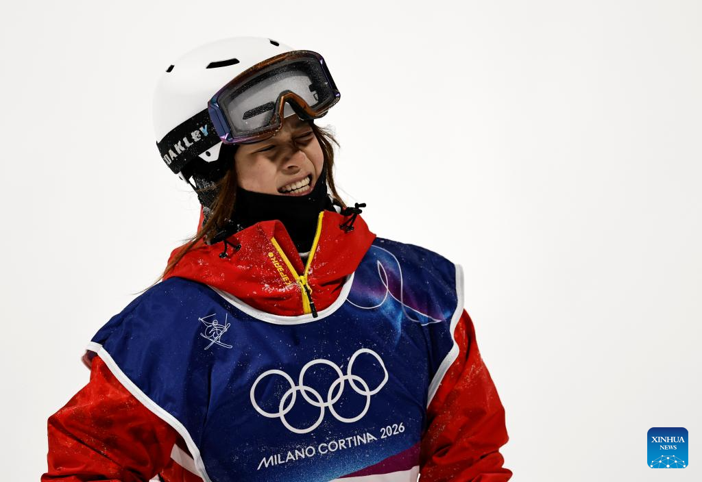 Liu Mengting of China reacts during the free skiing women's freeski big air qualification at the Milan-Cortina 2026 Olympic Winter Games in Livigno, Italy, Feb. 14, 2026. (Xinhua/Wang Peng)