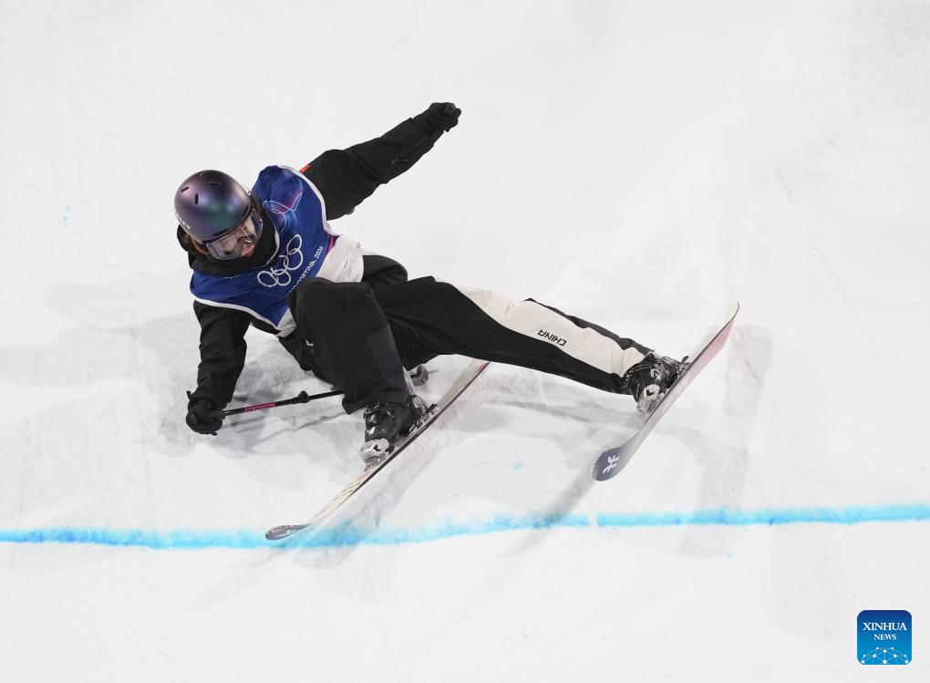 Liu Mengting of China falls during the free skiing women's freeski big air qualification at the Milan-Cortina 2026 Olympic Winter Games in Livigno, Italy, Feb. 14, 2026. (Xinhua/Hu Chao)
