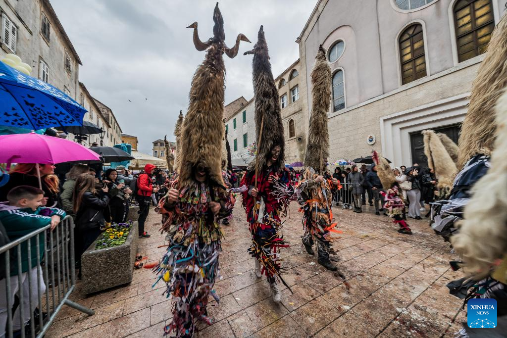 Groups from the Cetina region participate in a carnival parade in Sinj, Croatia, Feb. 14, 2026. (Zvonimir Barisin/PIXSELL via Xinhua)