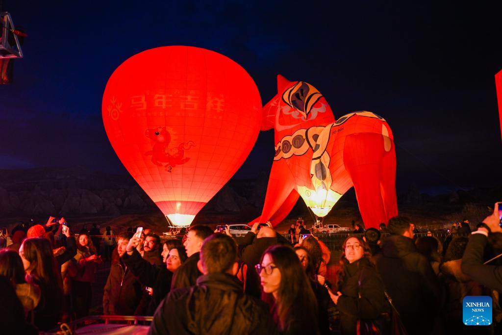 A hot air balloon themed on the Chinese Year of the Horse is inflated during a Chinese Spring Festival celebration in Cappadocia, Türkiye, Feb. 14, 2026. (Xinhua/Liu Lei)