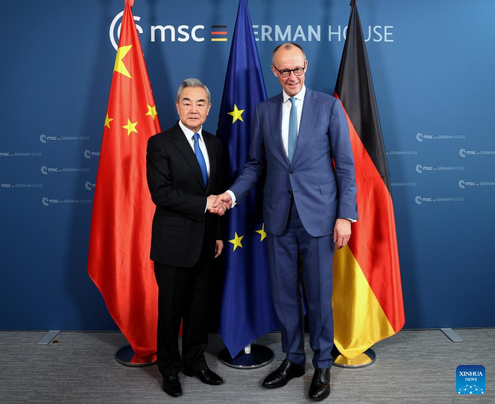 Chinese Foreign Minister Wang Yi, also a member of the Political Bureau of the Communist Party of China Central Committee, meets with German Chancellor Friedrich Merz in Munich, Germany, Feb. 14, 2026. (Xinhua/Li Ying)