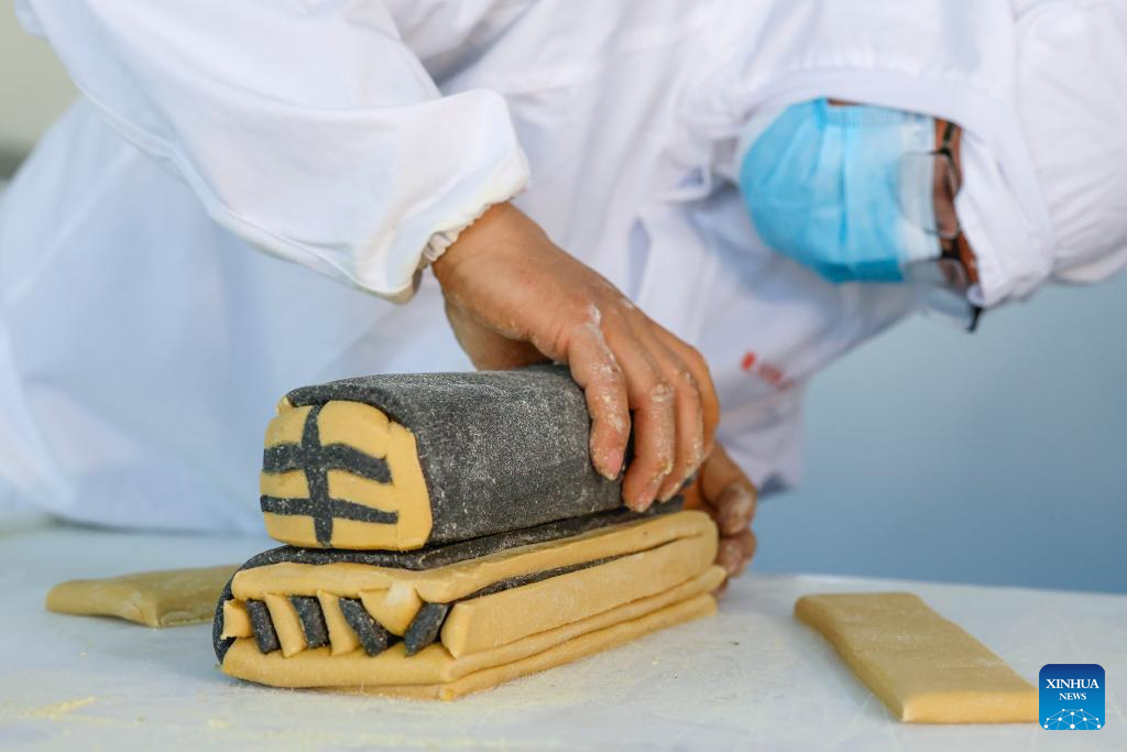 Staff members make character-inlaid candies in Qimen County of Huangshan City, east China's Anhui Province, Jan. 13, 2026.