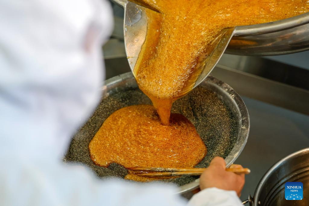 A staff member makes character-inlaid candies in Qimen County of Huangshan City, east China's Anhui Province, Jan. 13, 2026.
