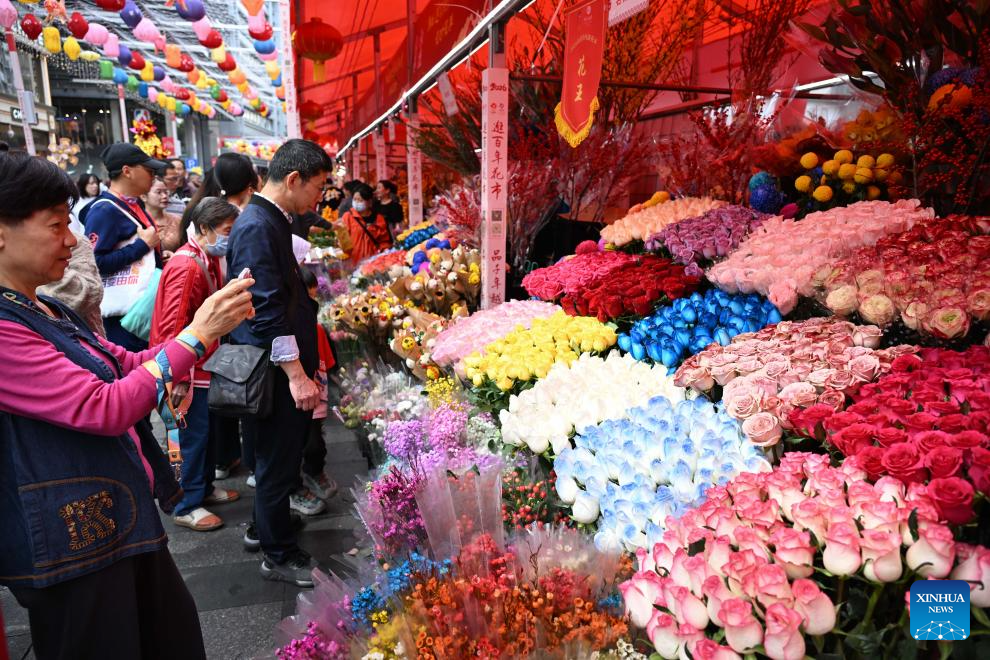 People buy flowers at a flower market in Yuexiu District, Guangzhou, south China's Guangdong Province, Feb. 15, 2026. China is alive with vibrant celebrations with the Spring Festival just around the corner. (Xinhua/Deng Hua)
