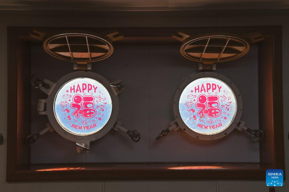 Spring Festival decorations are seen on portholes aboard the China Coast Guard (CCG) vessel Wanshan in the territorial waters of China's Huangyan Dao on Feb. 11, 2026.