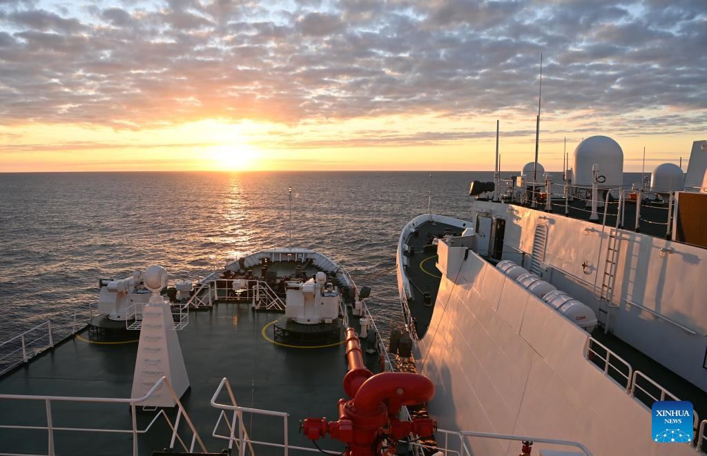 The China Coast Guard (CCG) vessels Wanshan (L) and Dongsha are pictured side by side during their mission handover in the territorial waters of China's Huangyan Dao on Jan. 26, 2026.