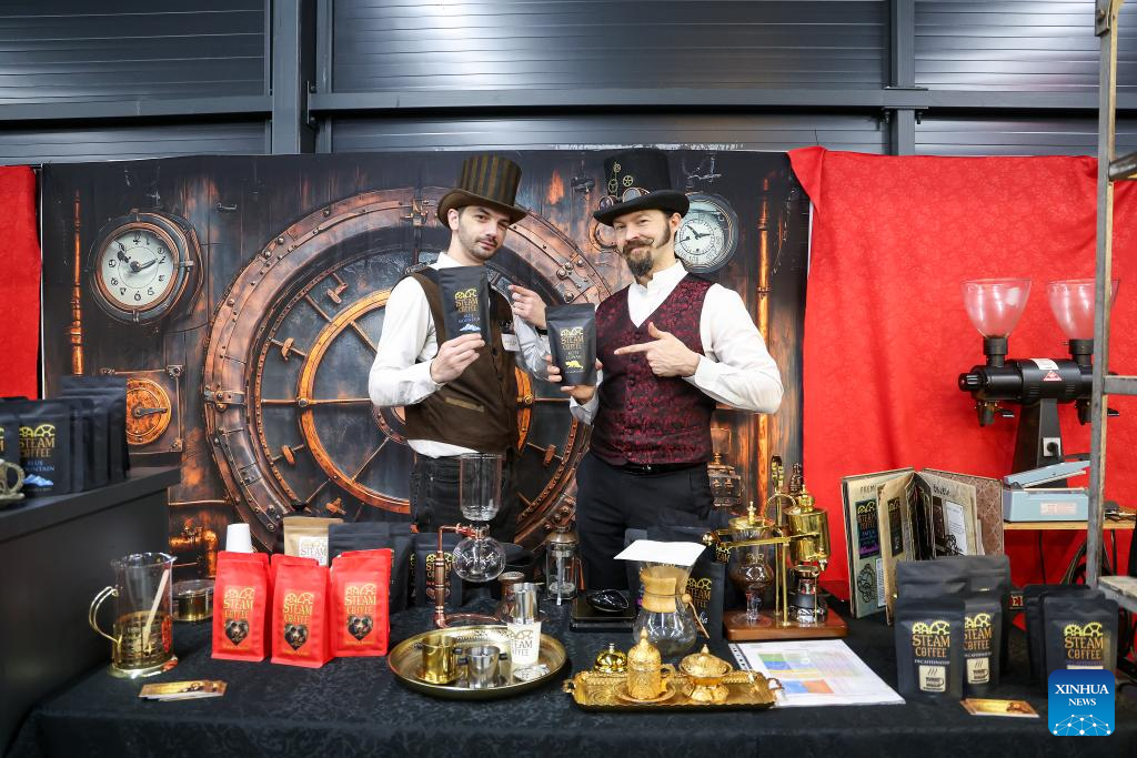 Exhibitors show coffee products at the fair Days of Chocolate and Coffee in Zagreb, Croatia, Feb. 15, 2026.