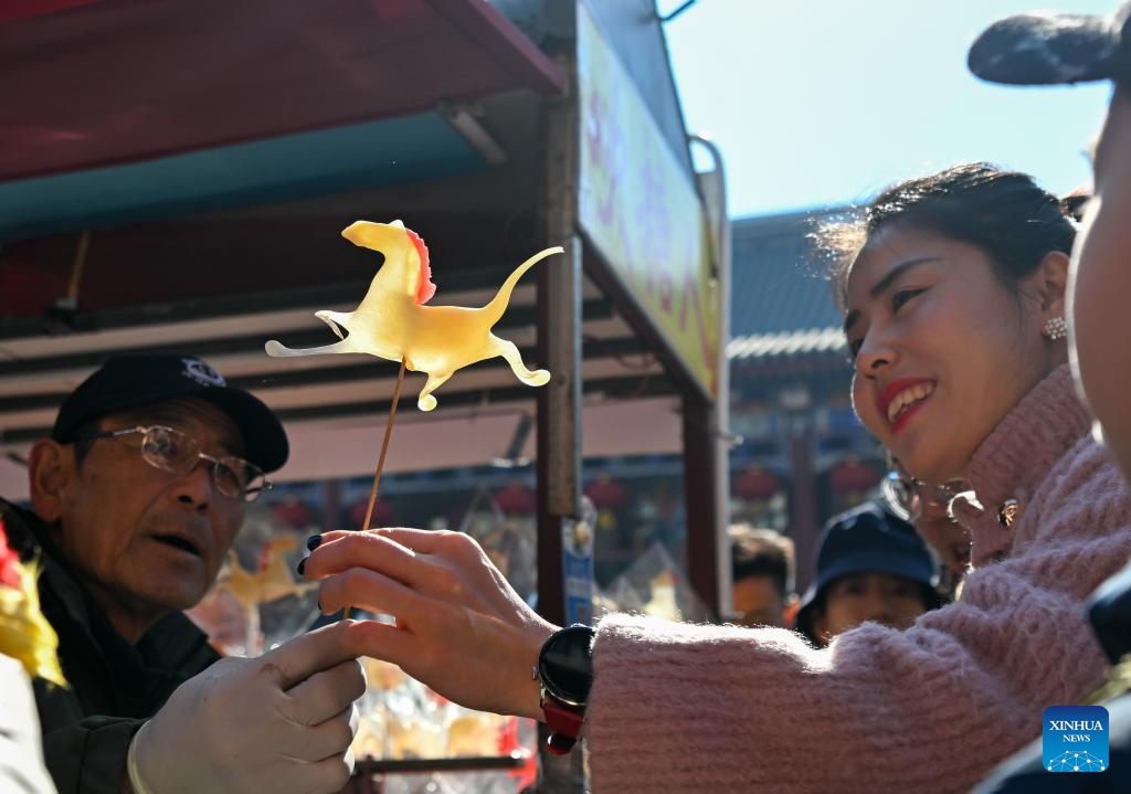 A customer holds a horse-shaped syrup figurine in north China's Tianjin, Feb. 17, 2026. This year's Spring Festival saw a surge of visitors eager to experience local cuisine, rich history and vibrant folk performances. (Xinhua/Sun Fanyue)