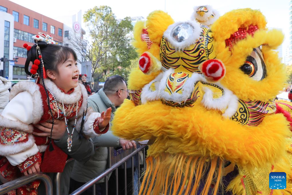 A child interacts with lion dance performers in Hai'an, east China's Jiangsu Province, Feb. 17, 2026. This year's Spring Festival saw a surge of visitors eager to experience local cuisine, rich history and vibrant folk performances. (Photo by Gu Binbin/Xinhua)