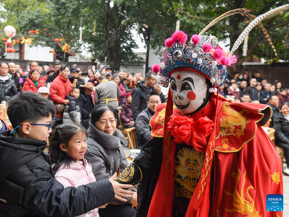 A man dressed as the God of Fortune interacts with visitors in Huaying City, southwest China's Sichuan Province, Feb. 17, 2026. This year's Spring Festival saw a surge of visitors eager to experience local cuisine, rich history and vibrant folk performances. (Photo by Zhou Songlin/Xinhua)