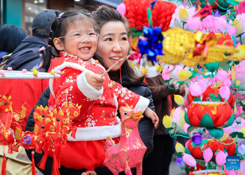 A child and her parent select lanterns at the Fuzi (Confucius) Temple scenic area in Nanjing, east China's Jiangsu Province, Feb. 17, 2026. This year's Spring Festival saw a surge of visitors eager to experience local cuisine, rich history and vibrant folk performances. (Photo by Su Yang/Xinhua)