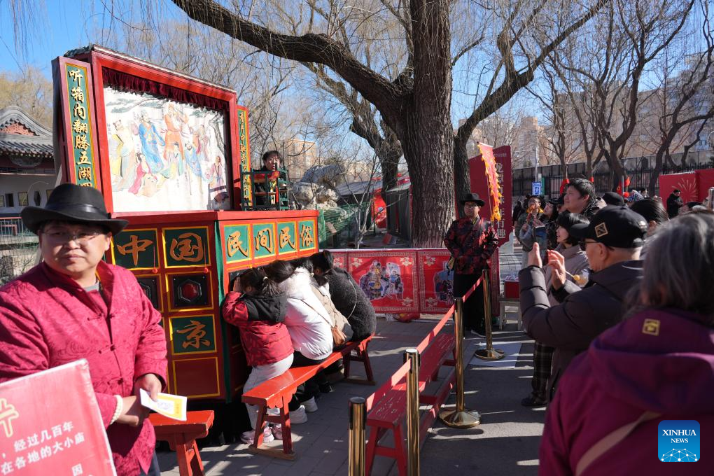 People watch a folk performance at a temple fair in Beijing, capital of China, Feb. 17, 2026. This year's Spring Festival saw a surge of visitors eager to experience local cuisine, rich history and vibrant folk performances. (Xinhua/Xie Han)