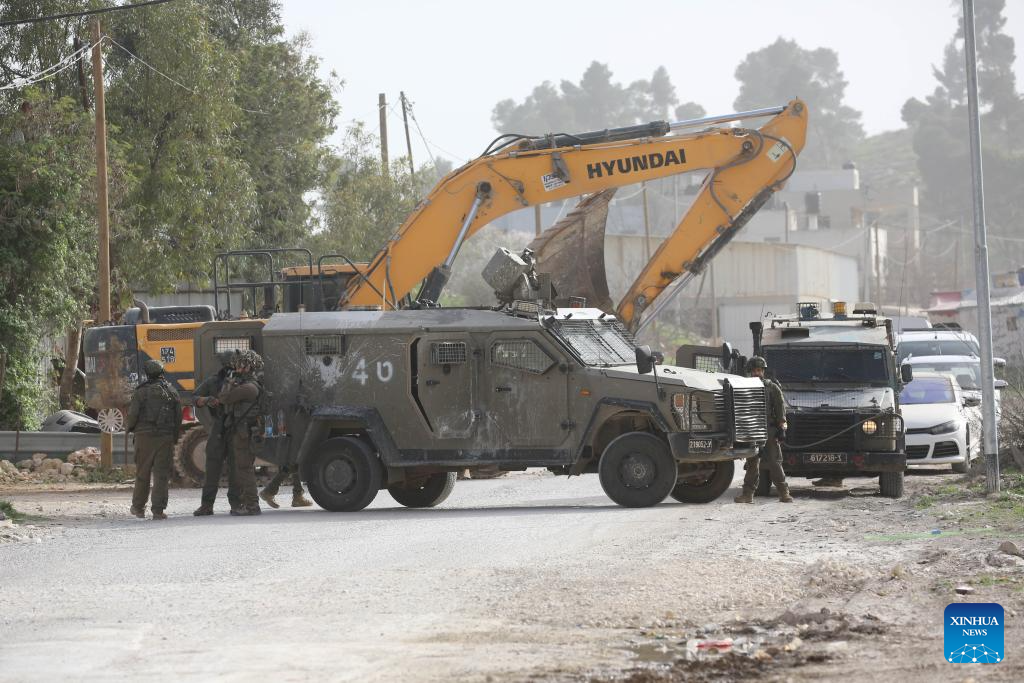 Members of Israeli forces stand guard as an Israeli excavator demolishes a car repair shop in south of Nablus in the West Bank, Feb. 16, 2026. (Photo by Nidal Eshtayeh/Xinhua)