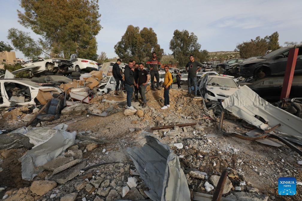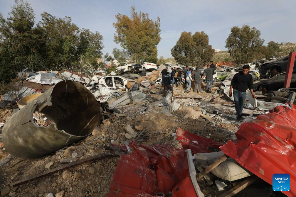 Palestinians inspect the damage after an Israeli excavator demolished a car repair shop in south of Nablus in the West Bank, Feb. 16, 2026. (Photo by Nidal Eshtayeh/Xinhua)
