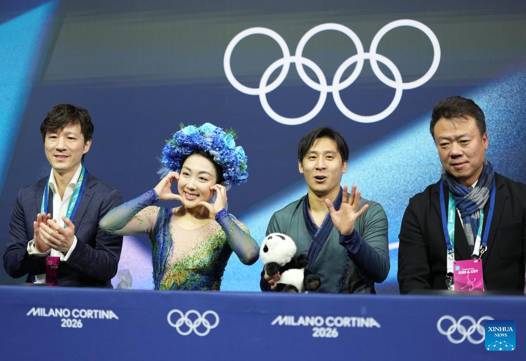 Sui Wenjing/Han Cong of China react in the kiss and cry area after their free skating performance of Figure Skating Pair Skating at the Milan-Cortina 2026 Olympic Winter Games in Milan, Italy, Feb. 16, 2026. (Xinhua/Xue Yuge)