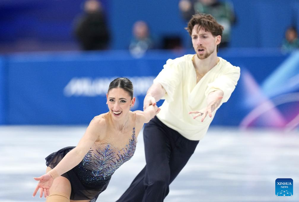 Sara Conti (L)/Niccolo Macii of Italy compete during the figure skating pair skating free skating match at the Milan-Cortina 2026 Olympic Winter Games in Milan, Italy, Feb. 15, 2026. (Xinhua/Xue Yuge)
