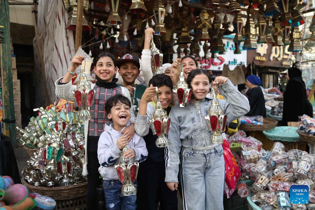 Kids hold traditional lanterns at a market ahead of Ramadan in Cairo, Egypt, on Feb. 16, 2026. (Xinhua/Ahmed Gomaa)