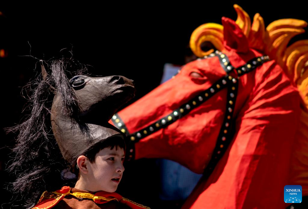 A boy wearing a horse-shaped hat attends the fifth edition of the Chinese New Year cultural festival in Mexico City, capital of Mexico, Feb. 14, 2026. The event brought a strong festive vibe to visitors. (Photo by David de la Paz/Xinhua)