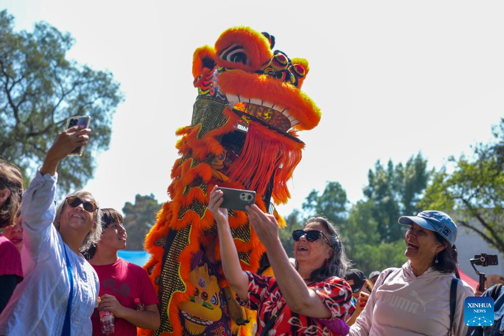 People take selfies with lion dance performers during the fifth edition of the Chinese New Year cultural festival in Mexico City, capital of Mexico, Feb. 14, 2026. The event brought a strong festive vibe to visitors. (Xinhua/Li Muzi)