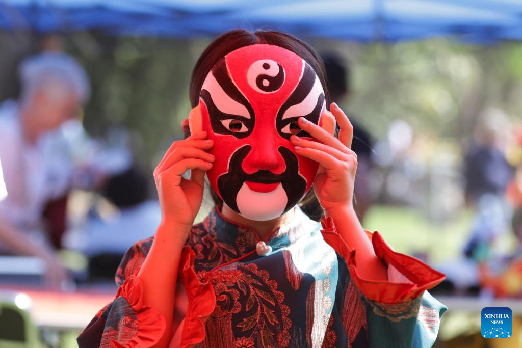 A visitor tries Peking Opera facial mask during the fifth edition of the Chinese New Year cultural festival in Mexico City, capital of Mexico, Feb. 14, 2026. The event brought a strong festive vibe to visitors. (Photo by Francisco Canedo/Xinhua)