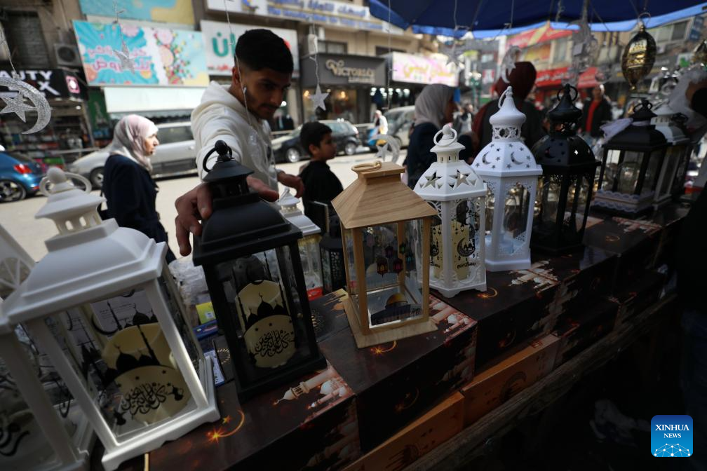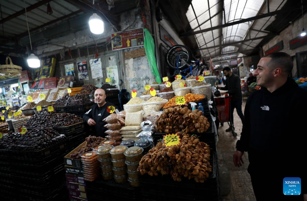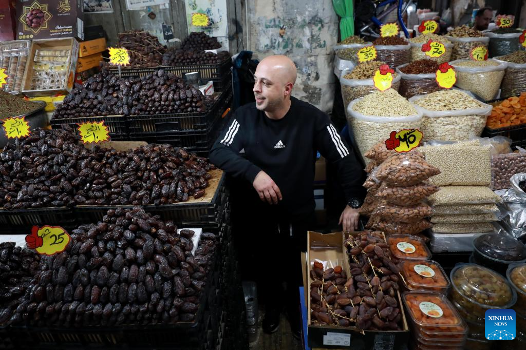 A Palestinian vendor is seen inside a market in the West Bank city of Nablus ahead of Ramadan, Feb. 16, 2026. (Photo by Ayman Nobani/Xinhua)