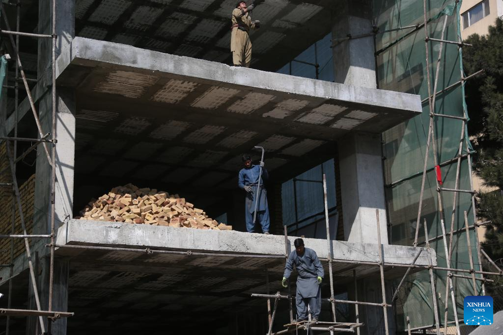 Afghan workers work at the construction site of a housing project in Kabul, Afghanistan, Feb. 18, 2026. (Photo by Saifurahman Safi/Xinhua)