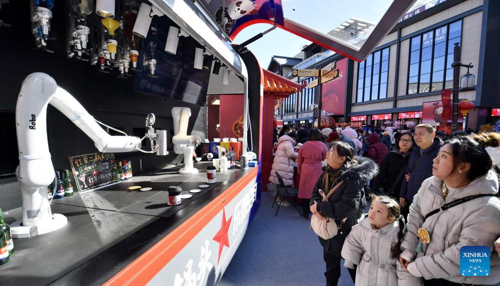 People look at a robot beverage bartender during a Spring Festival fair at Longfusi in Beijing, capital of China, Feb. 18, 2026. People visit cultural scenic areas in Beijing to feel the festive atmosphere of the Spring Festival. (Xinhua/Li Xin)
