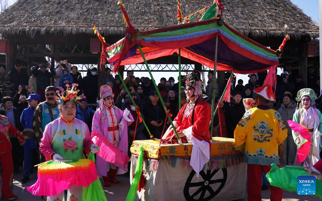 Artists stage a performance at a temple fair in Beijing, capital of China, Feb. 17, 2026. Temple fairs opened here celebrating the Spring Festival and presenting visitors with traditional dances, lion dances and delicious food. (Photo by Liang Zhiqiang/Xinhua)