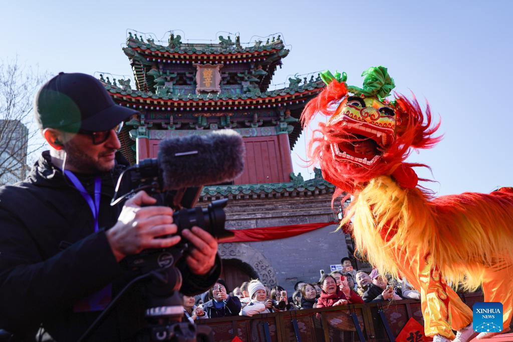 A foreigner films the lion dance performance at a temple fair in Beijing, capital of China, Feb. 17, 2026. Temple fairs opened here celebrating the Spring Festival and presenting visitors with traditional dances, lion dances and delicious food. (Xinhua/Chen Zhonghao)