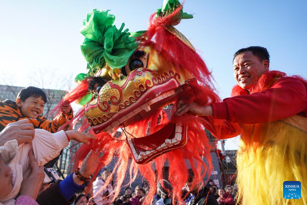 People interact with a lion dance performer at a temple fair in Beijing, capital of China, Feb. 17, 2026. Temple fairs opened here celebrating the Spring Festival and presenting visitors with traditional dances, lion dances and delicious food. (Xinhua/Chen Zhonghao)