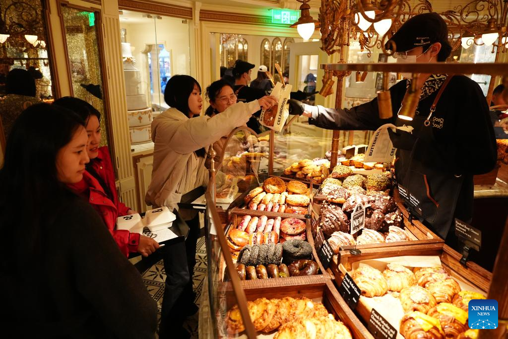 Customers buy breads at a bakery in Xi'an, northwest China's Shaanxi Province, Feb. 17, 2026. During this Spring Festival holiday, traditional Chinese New Year food and trendy cuisines have altogether become highlights for peoples' holiday consumption. (Xinhua/Shao Rui)