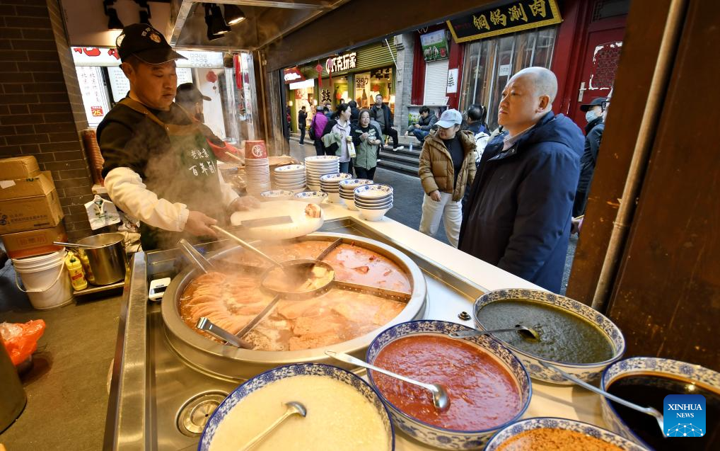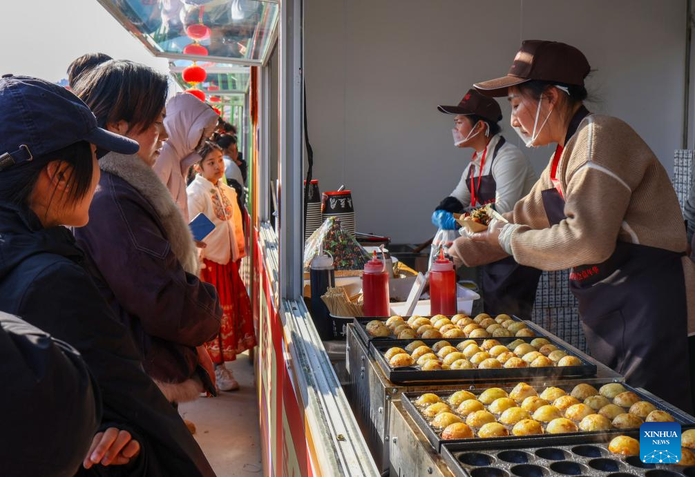 A staff member prepares lunch at a commercial area in Zouping, east China's Shandong Province, Feb. 18, 2026. During this Spring Festival holiday, traditional Chinese New Year food and trendy cuisines have altogether become highlights for peoples' holiday consumption. (Photo by Dong Naide/Xinhua)