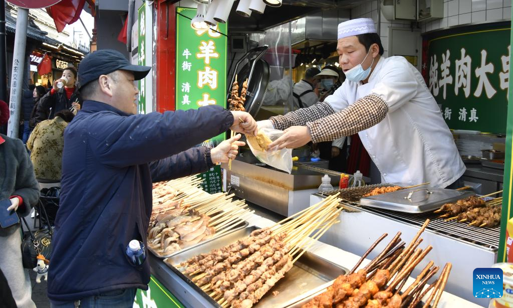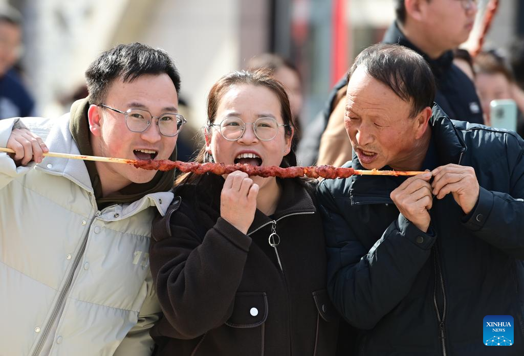 Tourists taste a skewer of kebab in Yan'an, northwest China's Shaanxi Province, Feb. 18, 2026. During this Spring Festival holiday, traditional Chinese New Year food and trendy cuisines have altogether become highlights for peoples' holiday consumption. (Photo by Qi Xiaojun/Xinhua)