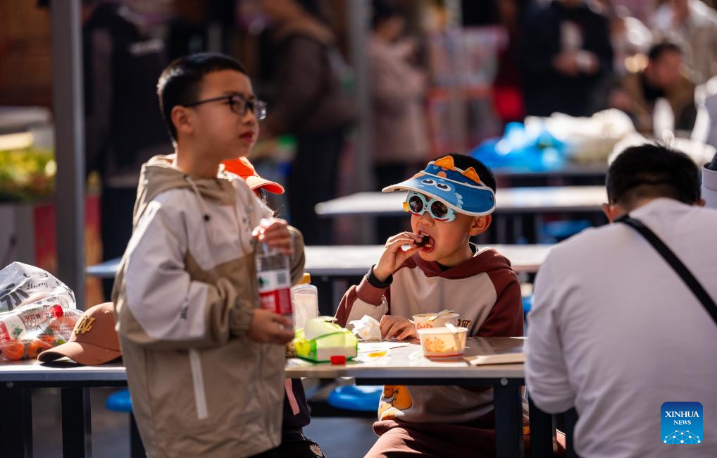 A boy eats tanghulu, a traditional Chinese snack consisting of sugar-coated haws or fruits, at a tanghulu-themed fair in Jiaozhou, east China's Shandong Province, Feb. 18, 2026. During this Spring Festival holiday, traditional Chinese New Year food and trendy cuisines have altogether become highlights for peoples' holiday consumption. (Photo by Wang Zhaomai/Xinhua)