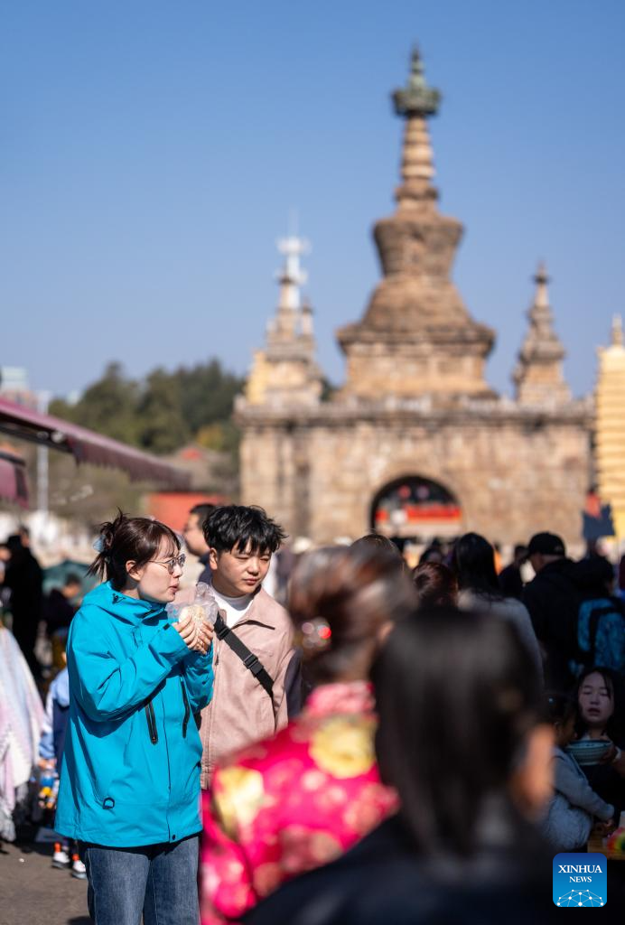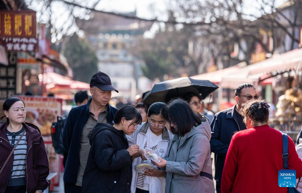 Tourists taste local specialties at Guandu ancient town in Kunming, southwest China's Yunnan Province, Feb. 18, 2026. During this Spring Festival holiday, traditional Chinese New Year food and trendy cuisines have altogether become highlights for peoples' holiday consumption. (Xinhua/Jiang Wenyao)