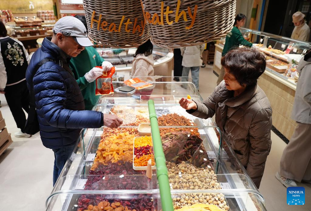 Customers buy dried fruits at a store in Xi'an, northwest China's Shaanxi Province, Feb. 17, 2026. During this Spring Festival holiday, traditional Chinese New Year food and trendy cuisines have altogether become highlights for peoples' holiday consumption. (Xinhua/Shao Rui)