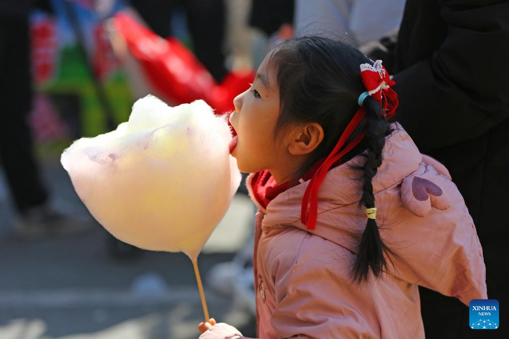 A girl tastes cotton candy at a park in Tengzhou, east China's Shandong Province, Feb. 17, 2026. During this Spring Festival holiday, traditional Chinese New Year food and trendy cuisines have altogether become highlights for peoples' holiday consumption. (Photo by Li Zhijun/Xinhua)